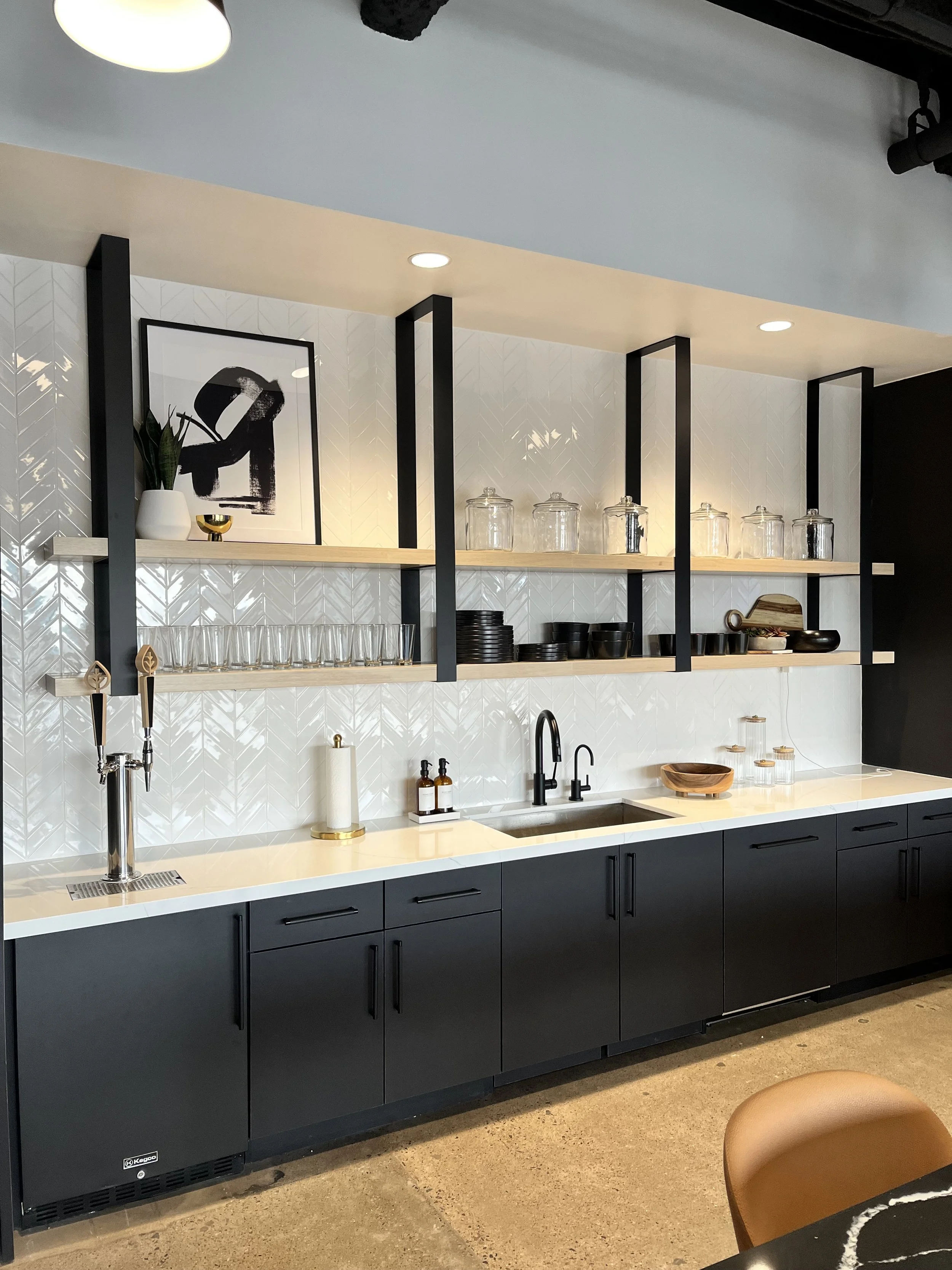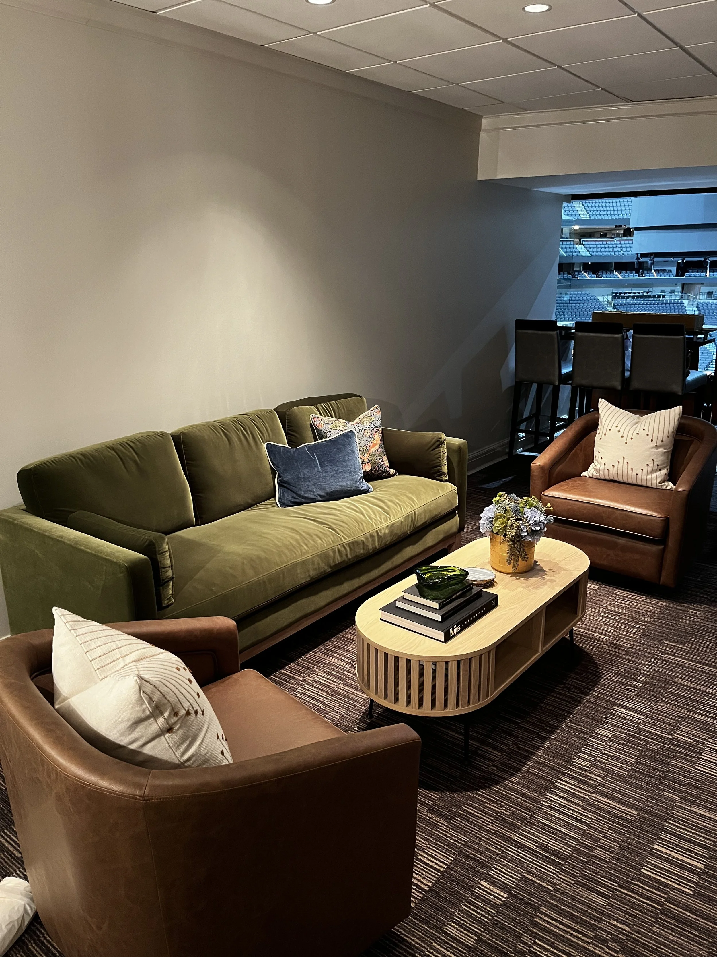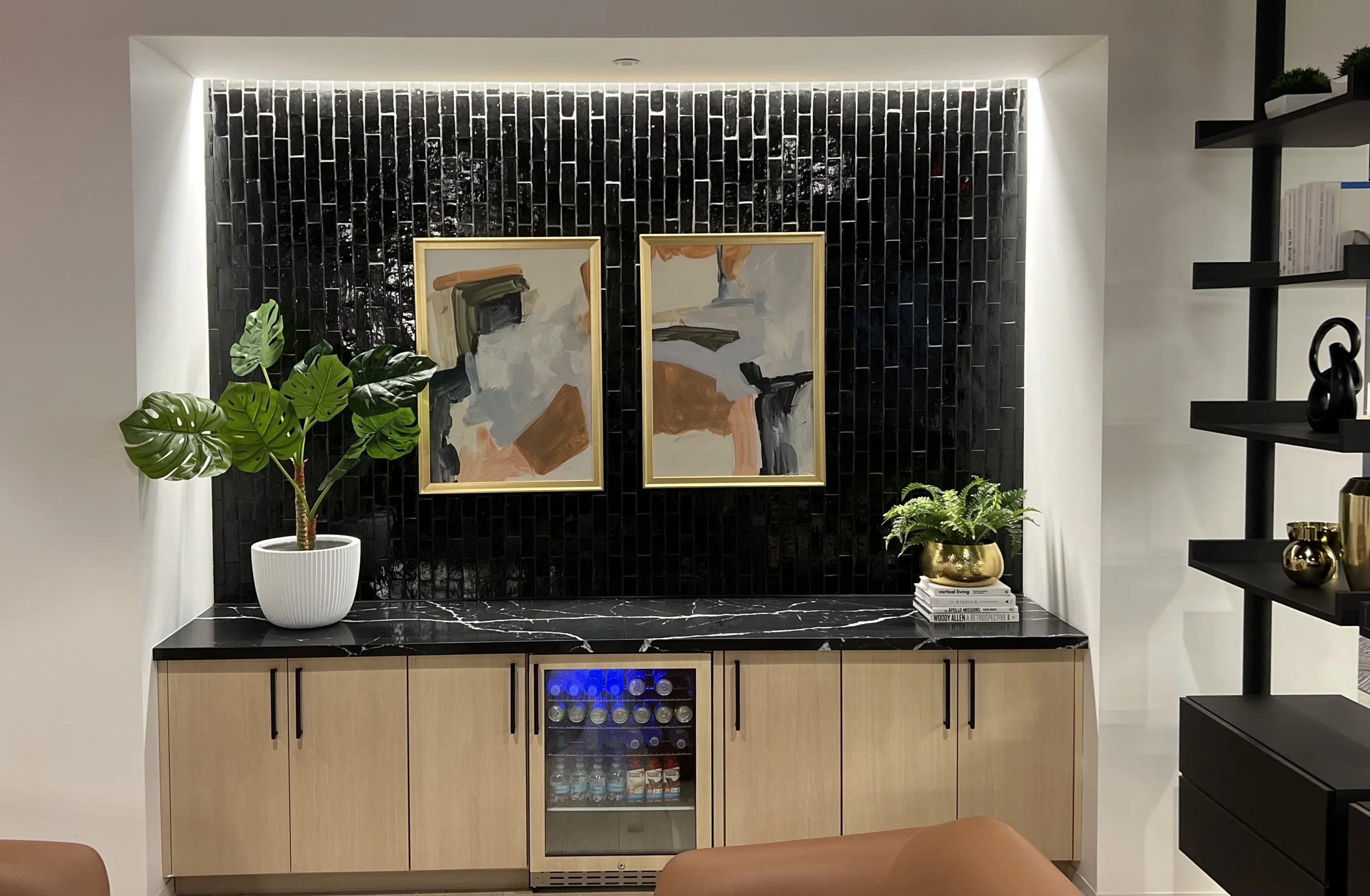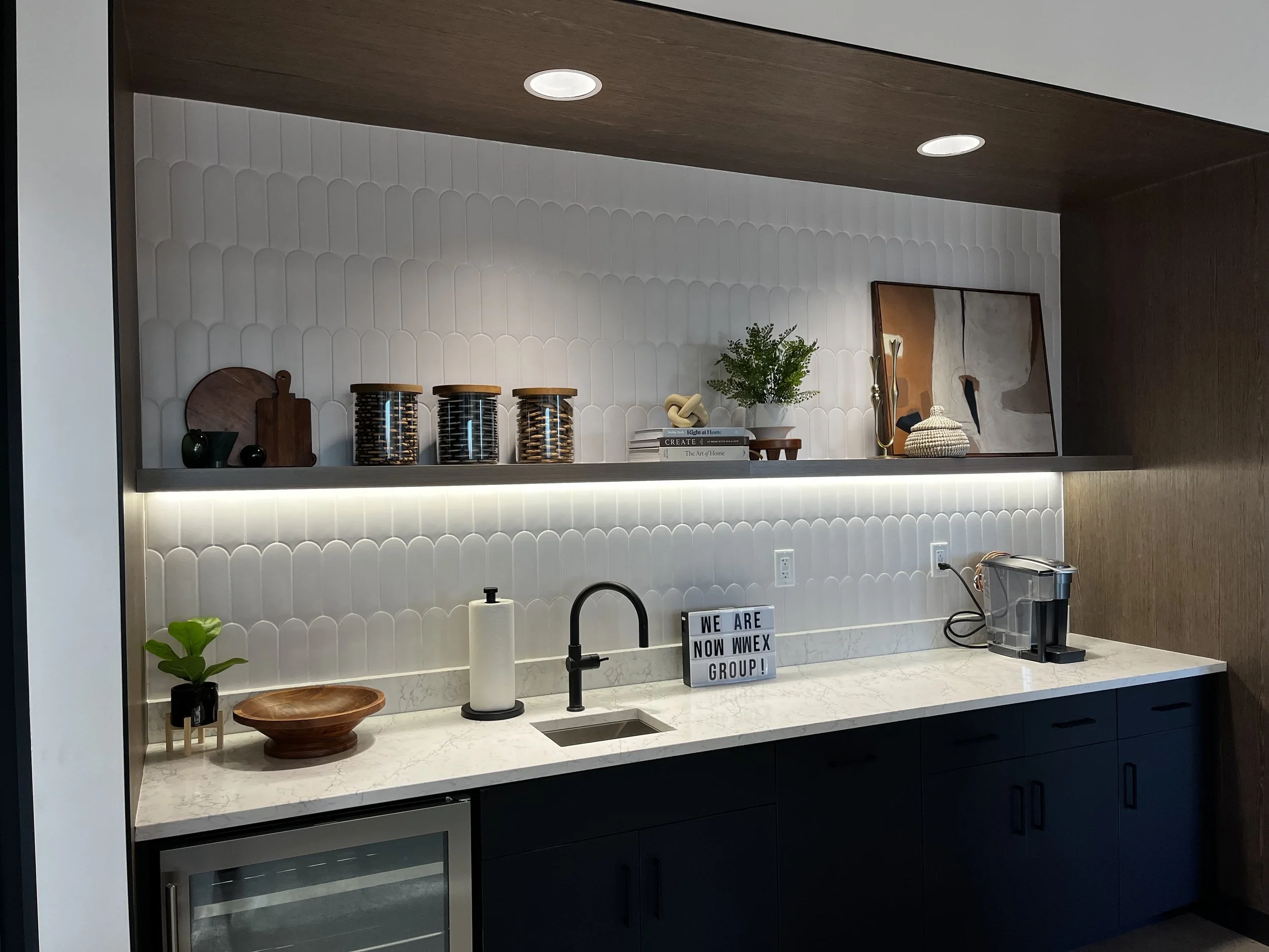 The suite owners’s goal was to create an inviting space to entertain clients and employees. New paint, lighting, countertops and an accent wall gave new life to this suite. Details such as faux florals, books and pillows elevated the space.