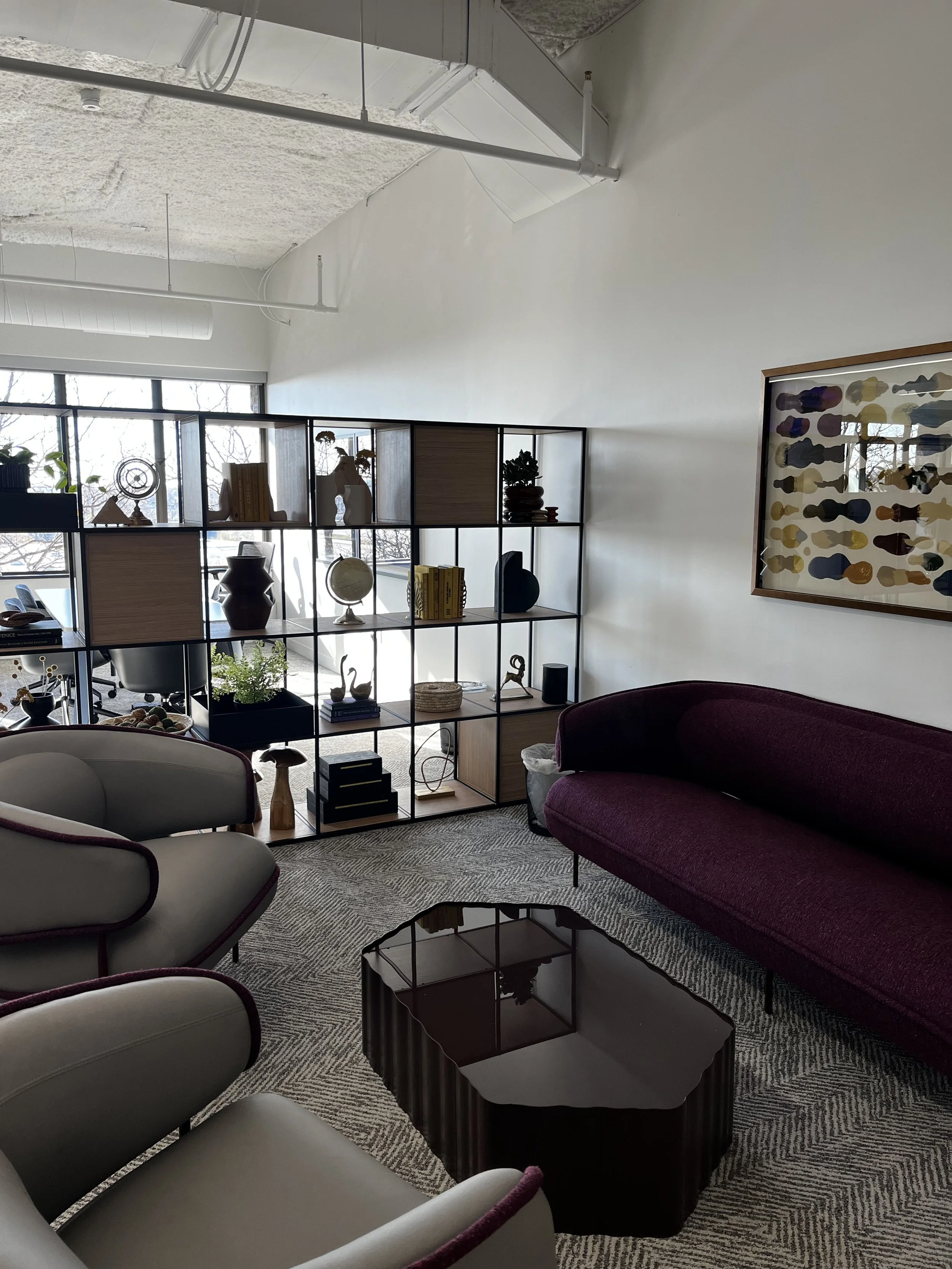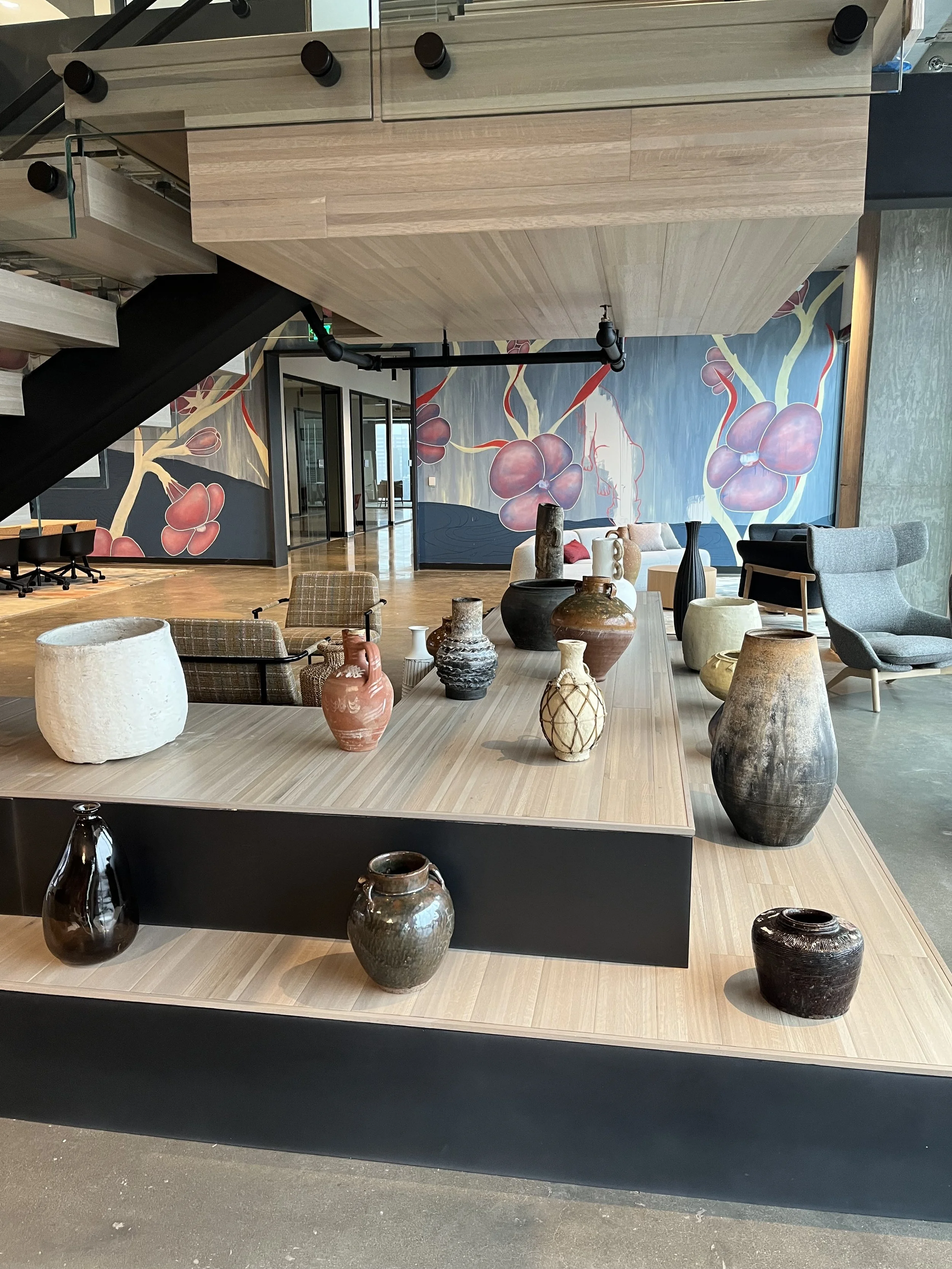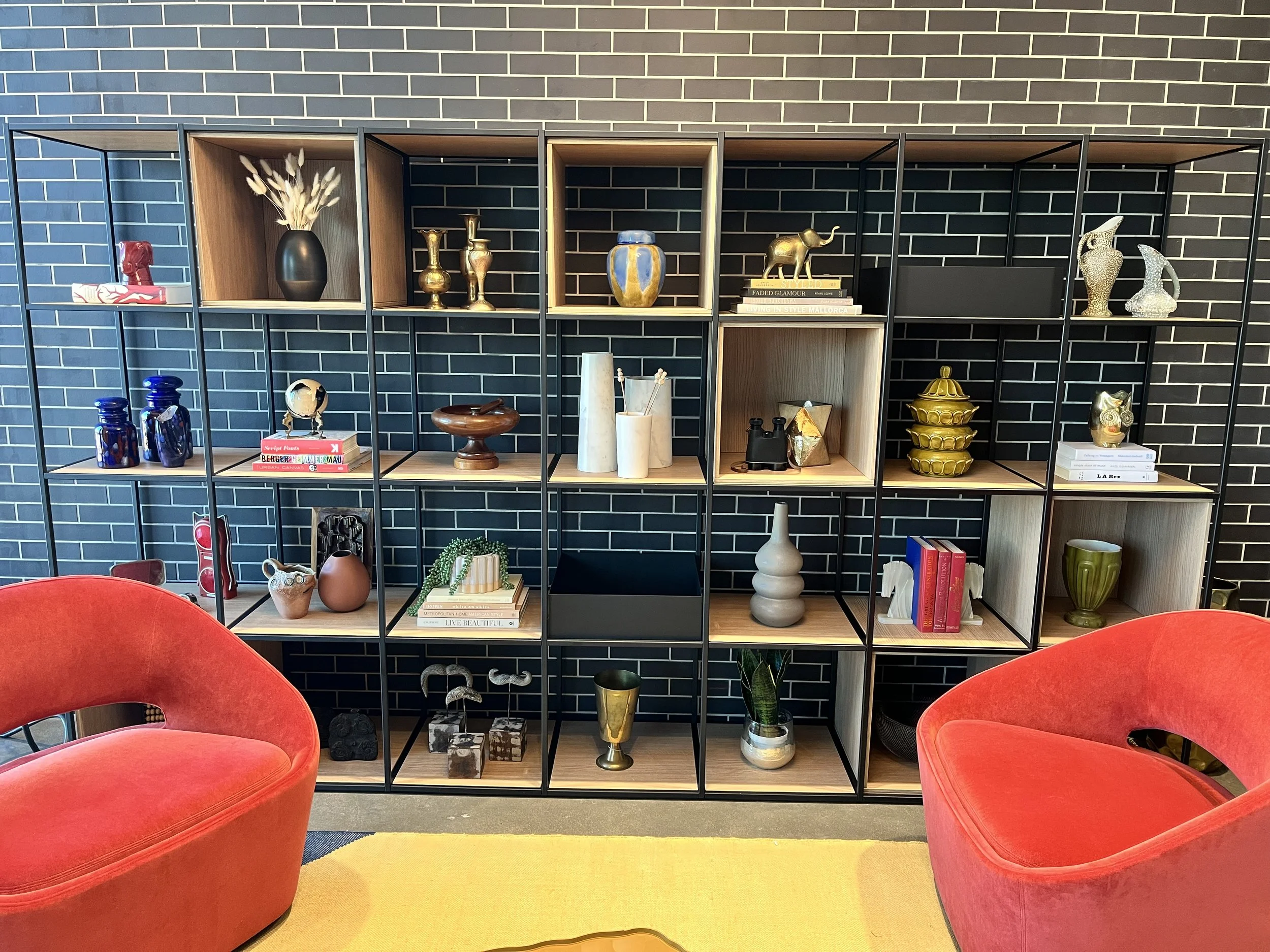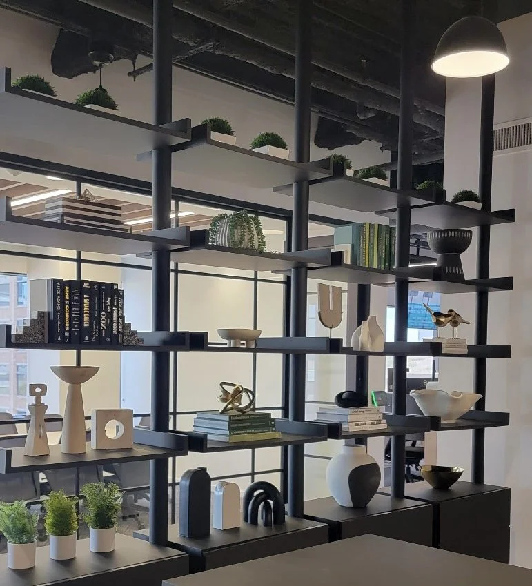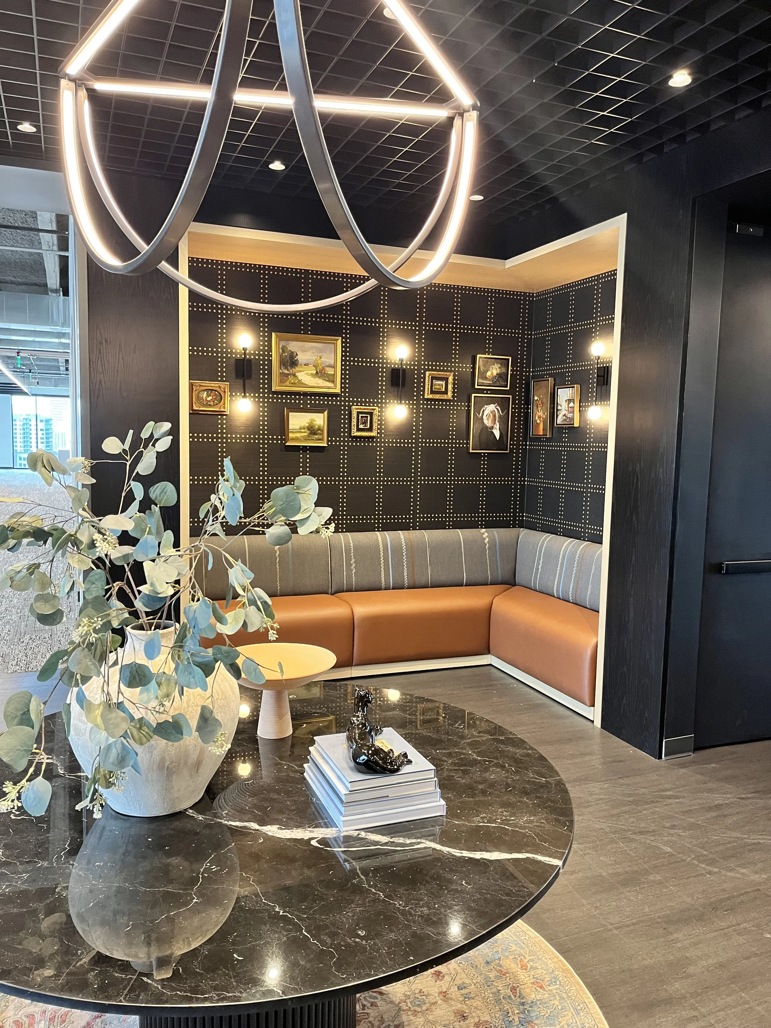 The inspiration for this space came from the Austin Proper hotel in Austin, Texas. I brought in an eclectic mix of pottery, brass, books and quirky art to match the edgy and cool vibe of the neighborhood where the office is located.